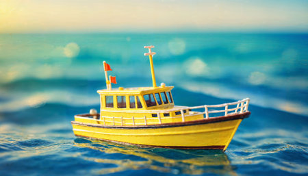 Miniature model of a fishing boat in the sea. Selective focus.