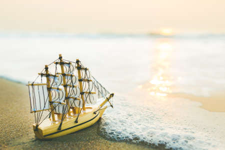 The toy sailboat is on the beach in the morning sunshine. Summer holiday travel concept
