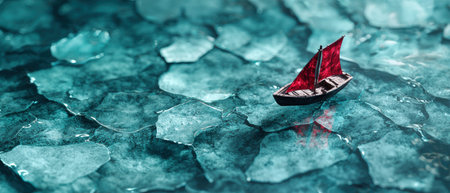 Miniature sailboat floating on icy waters
