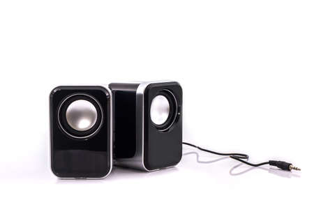 Black music sound speaker witn cable isolated on red background. Audio equipment.