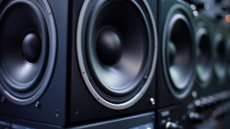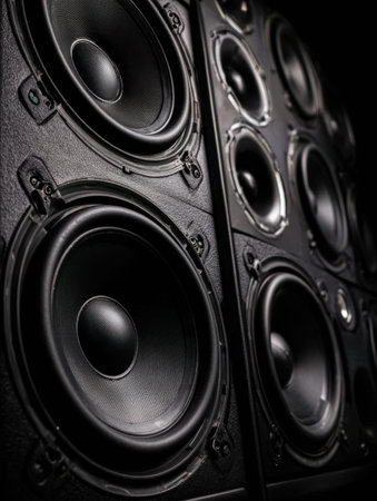 Powerful concert speakers are stacked closely together against a dark background. This setup creates visual focus for music events or sound systems.