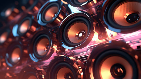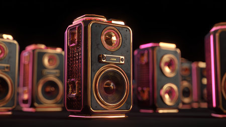 A close-up view displays multiple audio speakers, each distinguished by a unique combination of black and gold with a metallic finish. The scene features shallow depth of field, highlighting the speakers against a dark background. This image is suitable for promotional materials, website design elements, and other commercial applications.