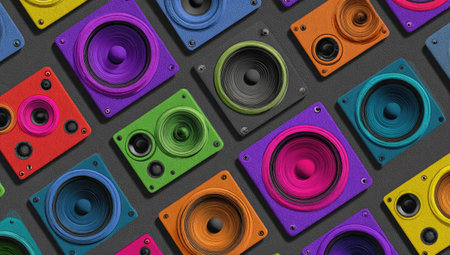 This image features a collection of various colored audio speakers arranged in a pattern. The design showcases a range of bright hues, geometric shapes, and a repetitive composition. It could be used for advertising, graphic design projects, or editorial content related to music and audio technology. The lighting is even, casting no shadows.