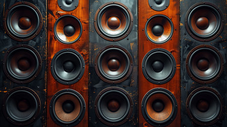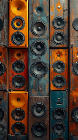 Different vintage audio speakers are creating a visually captivating wall, showcasing diverse designs and suggesting a powerful sound system for music enthusiasts and audiophiles