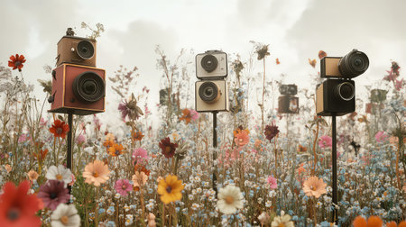 A captivating scene featuring vintage cameras standing amidst a vibrant field of wildflowers, creating an artistic and imaginative landscape perfect for photography lovers.