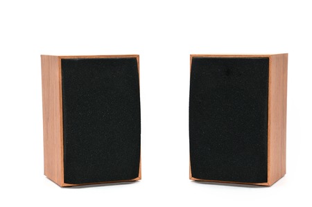 Single home high fidelity two-way loudspeaker system with bass reflex port in wooden housing on a black background