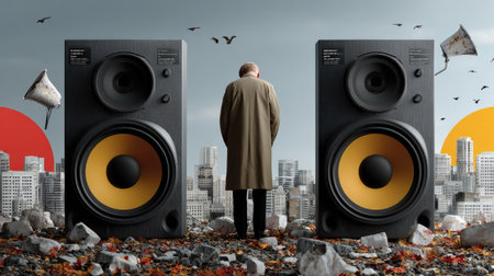 A solitary man stands between large speakers in a surreal urban setting, combining vibrant colors and autumn elements for a stunning visual composition.