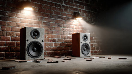 A pair of vintage speakers set against a rustic brick wall, highlighted by warm lighting, creating a cozy and inviting atmosphere ideal for music lovers.