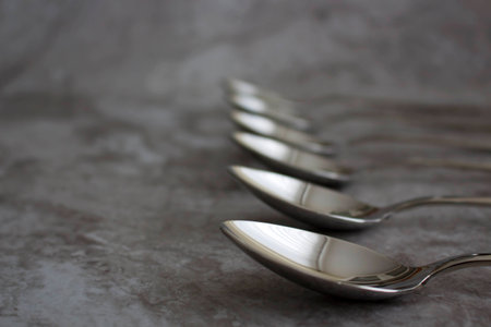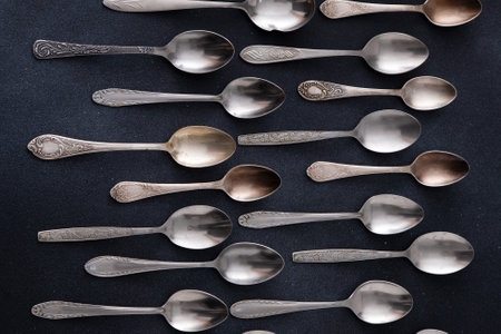 Set of different spoons. Silver cutlery on a black background. Spoon on the table