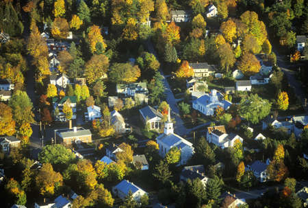 Aerial view of Morrisville, VT in Autumn on Scenic Route 100 at sunset