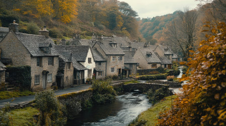 A picturesque village nestled in a valley, with stone cottages and a river running through it