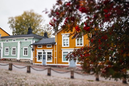 View of old Porvoo, Finland. Beautiful city autumn landscape with colorful wooden buildings.