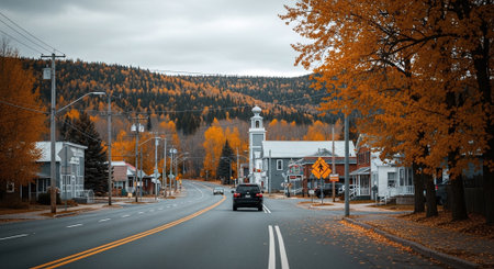 A picturesque view of a quaint cobblestone street lined with colorful houses, surrounded by stunning autumn foliage, creating a serene atmosphere perfect for exploration.