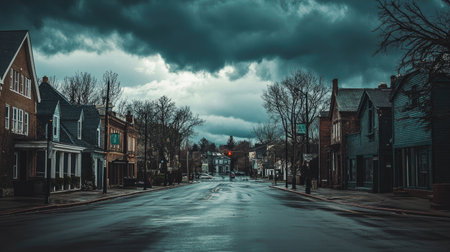 A town street with dramatic storm clouds gathering in the background, creating a moody scene.
