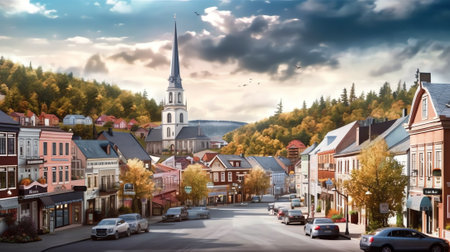 Cozy Small Town Street in Autumn with People Walking on a Sunny Morning