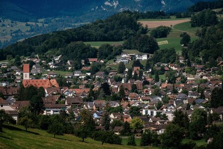 Panorama of a small old European town, many small houses, tilt-shift effect