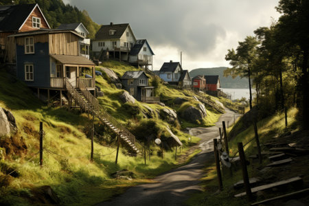An inviting view features two houses framed by a wooden foreground. The image displays a daylight scene with warm tones and textured wooden elements. The composition suggests an inviting atmosphere. Suitable for a range of creative projects, this image could be used for websites, brochures, or editorial content.