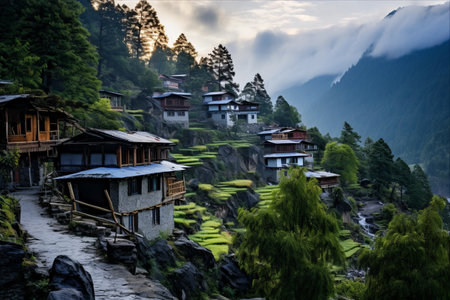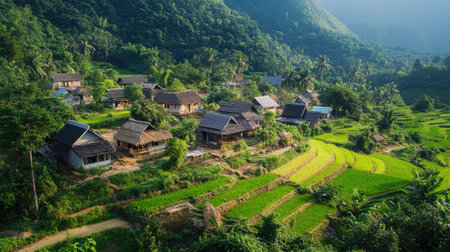 Peaceful Southeast Asian mountain village with traditional houses and terraced fields, rural charm