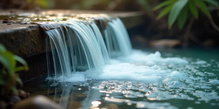 Gentle water flows over smooth stones into a calm pond, creating ripples. Lush green plants frame the scene, enhancing the sense of serenity and natural beauty.