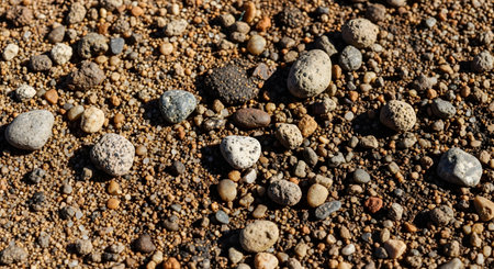 A top-down view shows a textured ground surface composed of coarse sand and small, multi-colored pebbles. The natural mix of stones creates a detailed and organic background pattern.