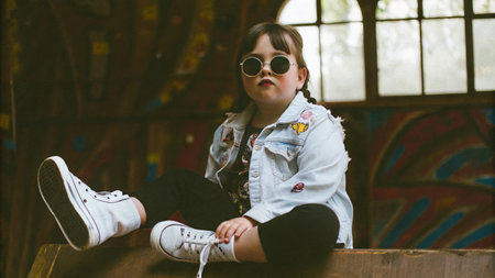 Trendy young girl in sunglasses and denim jacket sitting indoors.