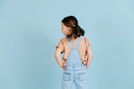Fashionable little girl posing with her back turned, looking to the side over blue background. She has two ponytails, wears overalls. Hands in pockets.