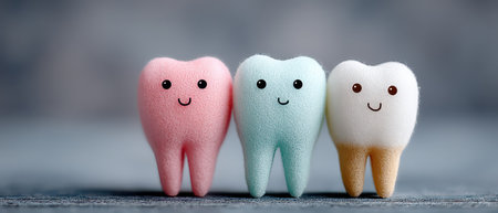 Three cheerful cartoon teeth figurines in pastel colors stand side by side. Each tooth has a smiling face creating a playful atmosphere.