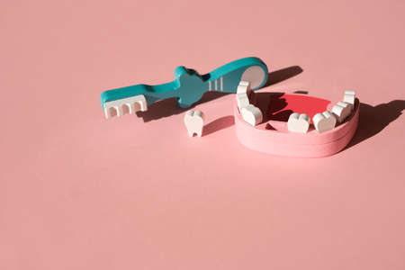 Model of a jaw with a fallen tooth and a toothbrush - the concept of dental care, prevention of caries and periodontal disease. Professional teeth cleaning. Children's wooden toy. Playing Doctor