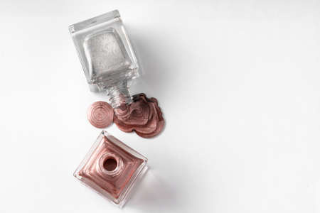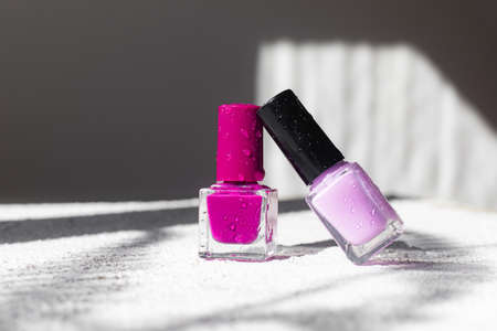 Nail polish on a white background with shadows. The concept of nail polish without inscriptions. Light background and shadows. Copy space. Article about the choice of varnish. Cosmetology