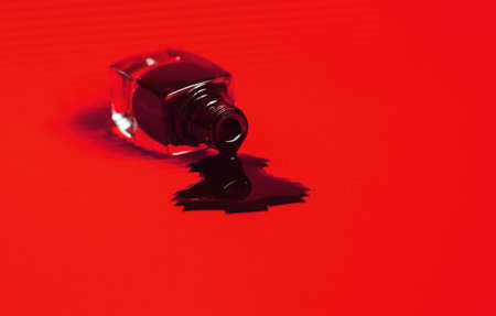 Dark nail polish spilled from the bottle. Vibrant bright red background.