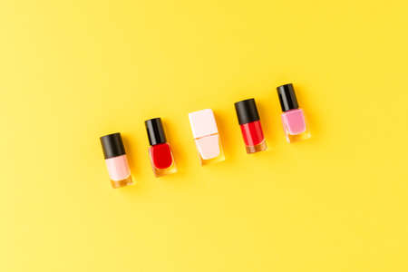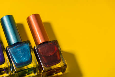 Nail polish bottles on a yellow background. Beauty and fashion concept