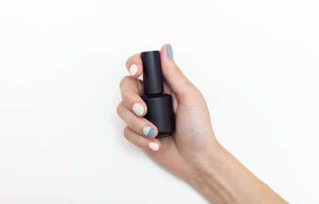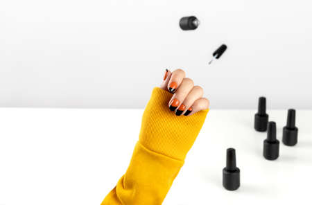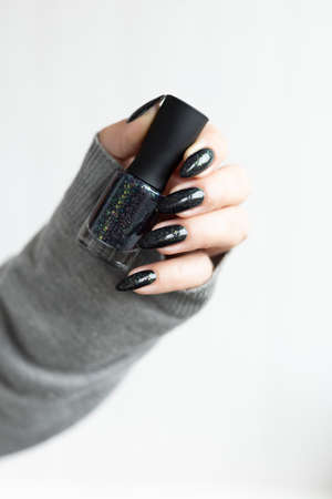Female hand with long nails and black manicure holds a bottle of nail polish