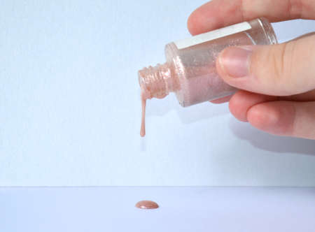 Yellow nail varnish drop fall from bottle. Nail polish drop fall on blue background. copy space.