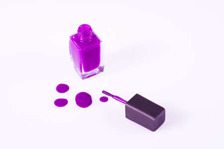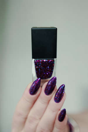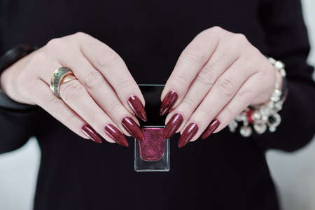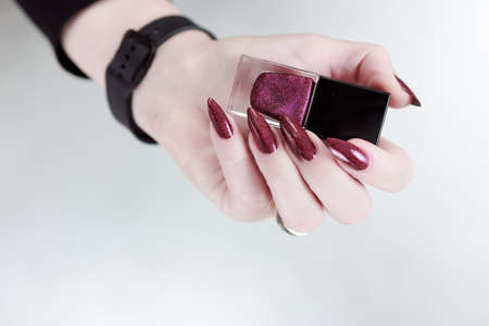 Female hand with long nails and purple plum manicure holds a bottle of nail polish