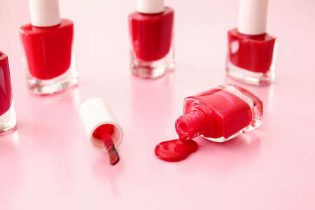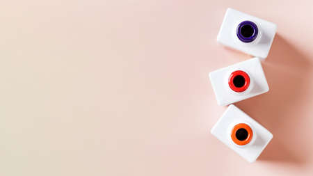 Bottles of colorful varnishes, shellacs for nails stand on a light pink colored background. Copy space. Banner