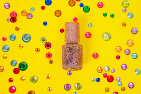 Close up top view on the bottle with silvered pink nail polish or glitters on bright yellow background with multicolored sequins and artificial jems.