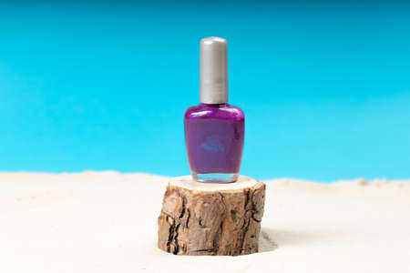 purple nail polish in a glass bottle standing on a pedestal, a pedestal in the form of a pine stump. sand and products