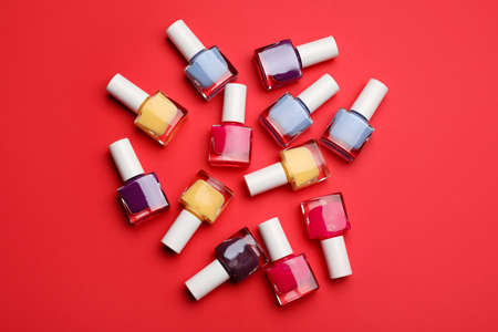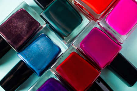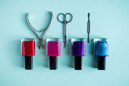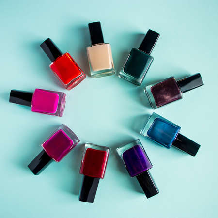 Group of bright colored nail polishes on a blue background. Set of decorative cosmetics for body care.