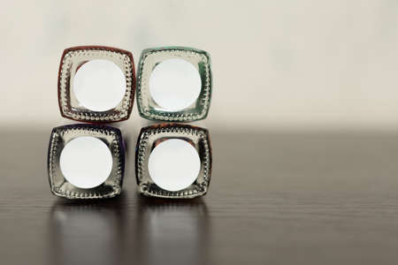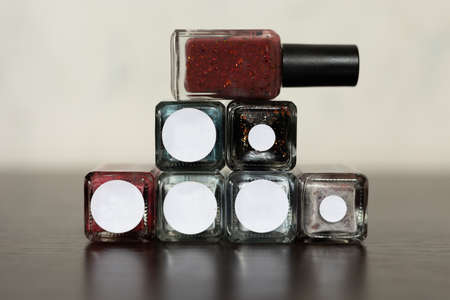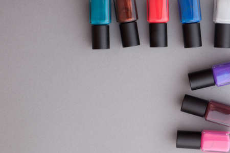 Collection of multi-colored bottles of nail polish. Layout for design on a gray background and a wooden table.