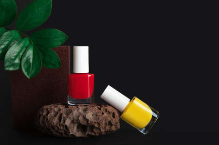 Cosmetic nail polishes on trendy podium. Red and yellow gel polish on dark background with natural leaves.