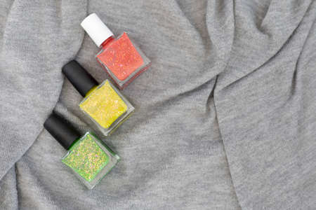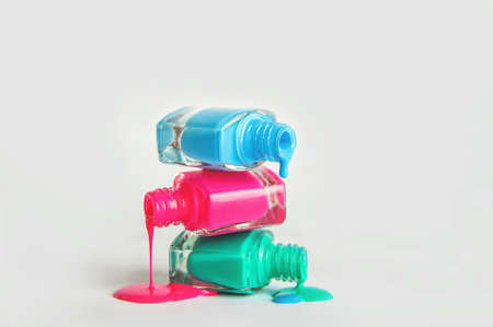 Pink, blue and green nail polishes spill over gray background and copy space. Nail care concept, gel polish pyramid.