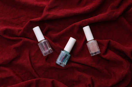 Manicure scissors and nail polish bottles on red silk background. beauty concept
