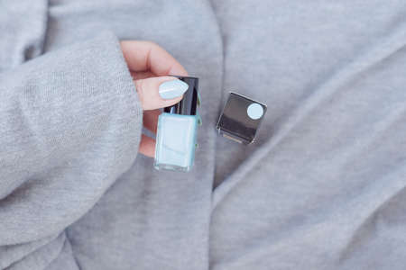 Female hand with long nails and a bottle of light blue lilac color nail polish