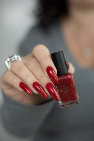 Female hand with orange nail design. Glitter orange nail polish manicure with red nail art. Woman hand hold yellow nail polish bottle on gray background.
