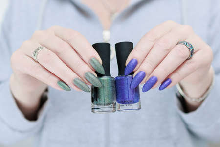 Woman's hand with long nails and turquoise blue manicure with bottles of nail polish
