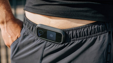 A closeup examination of fitnessfocused shorts showcasing a digital display integrated into the waistband that provides workout summaries and health metrics without a bulky form.