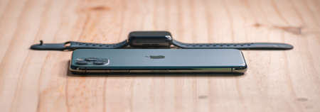 Iwatch with a rubber strap and iPhone X charging on a modern wireless charger on a dark surface with a green glare. Space for your text. Horizontal position. Minsk, Belarus, 1.03.2021.