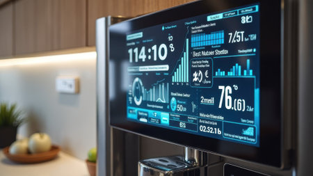 Modern smart refrigerator display showing nutrition and temperature data. That the image is generated using AI.