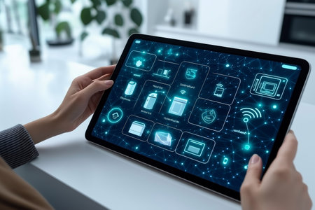 A person using a tablet to control smart home features in a modern kitchen. This image showcases technology integration in home design and convenience.