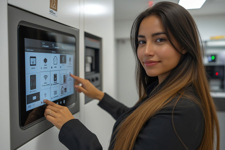 Latinas Woman using a smart home control panel to manage devices, demonstrating control and technology in a modern setting. Her expression shows focus and interest in the system.